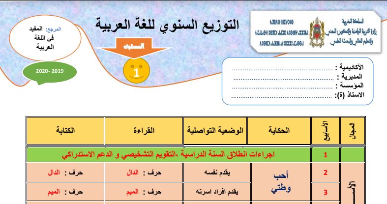 التوزيع السنوي المفيد في اللغة العربية المستوى الاولى اعدادي