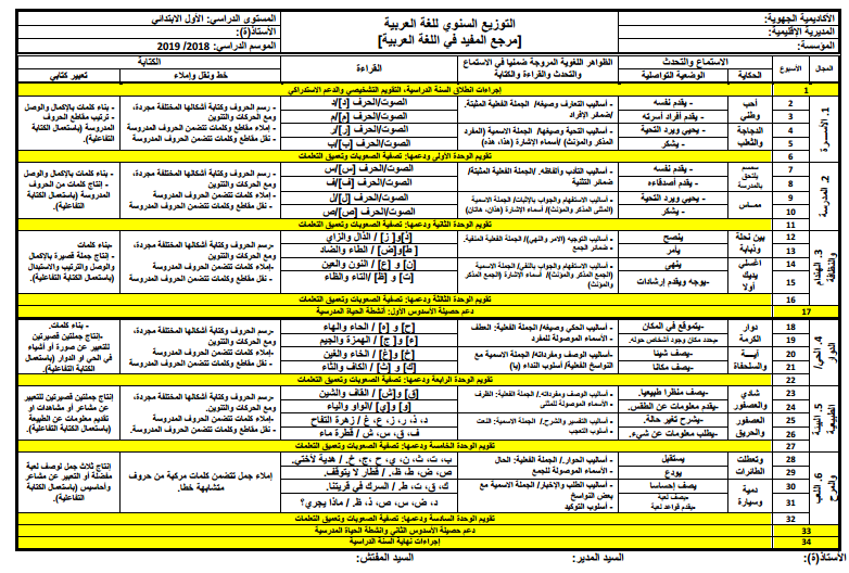 التوزيع السنوي مادة اللغة العربية المستوى الأول 2018 2019