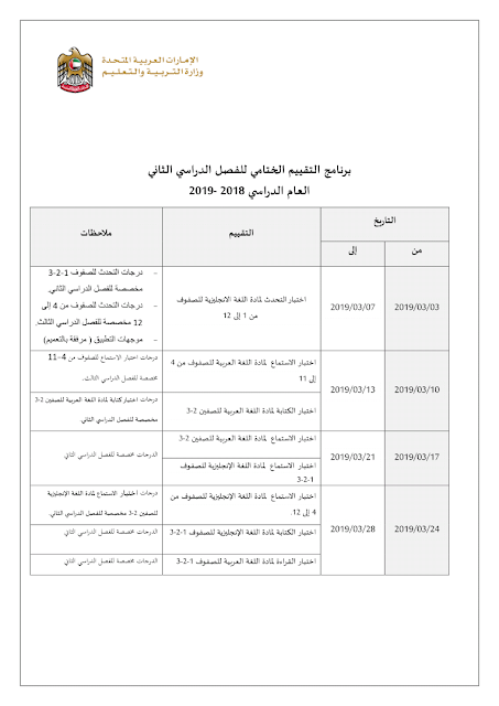 جدول امتحان نهاية 2019 لجميع الصفوف أخبار الامتحانات الفصل الثالث 2018 2019 المناهج الإماراتية