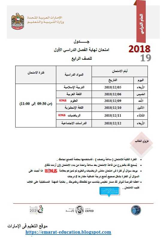 جدول الامتحانات 2019 الإمارات الفصل الدراسي الأول جميع المراحل التعليمية وزارة التربية والتعليم نجوم مصرية
