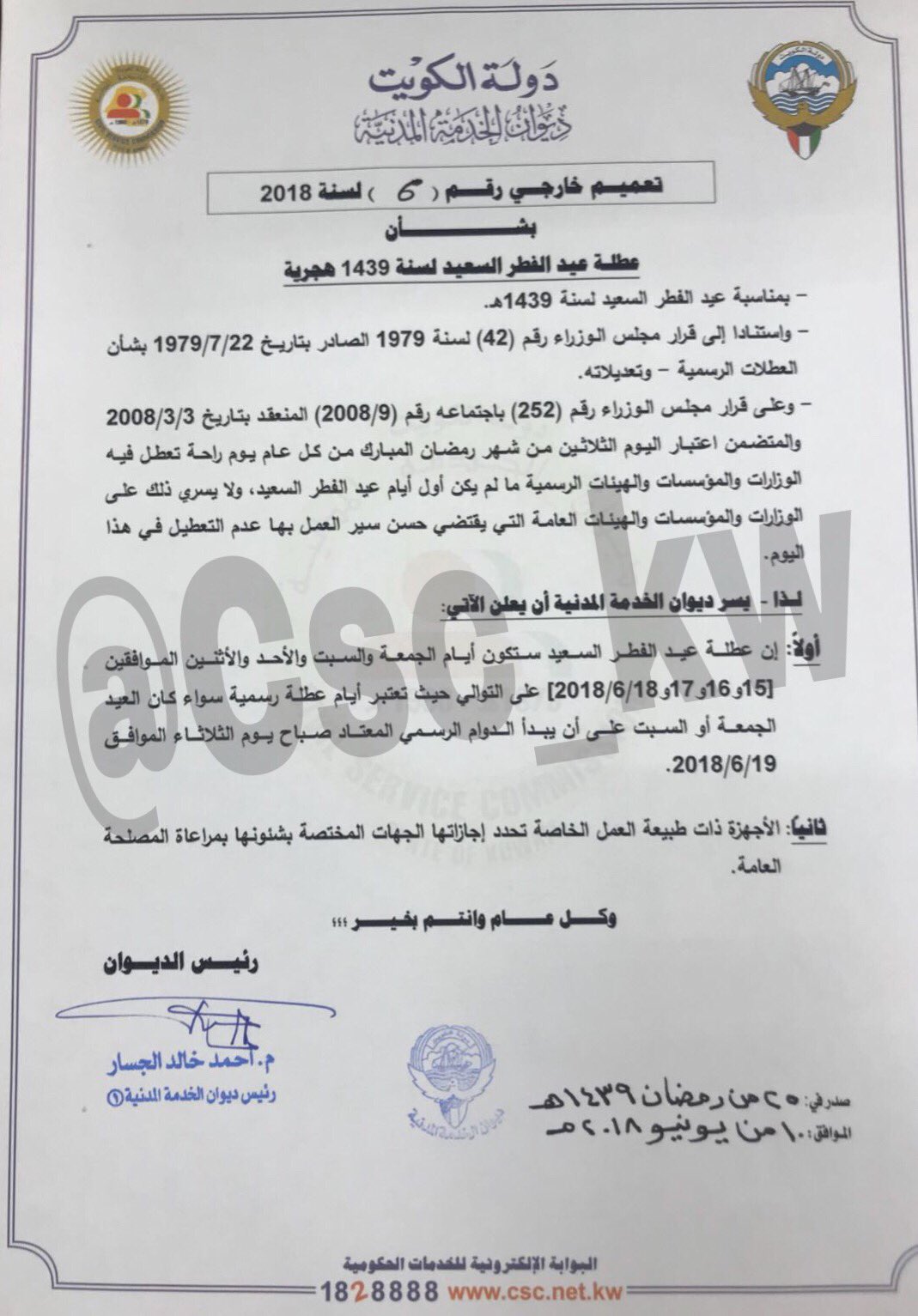 فواز سعد أبوالروس Twitterren ديوان الخدمة المدنية تعميم خارجي رقم 6 لسنة 2018 بشأن عطلة عيد الفطر السعيد لسنة 1439 هجرية لذا يعلن ديوان الخدمة المدنية بأن العطلة ستكون يومي الأحد والأثنين الموافق