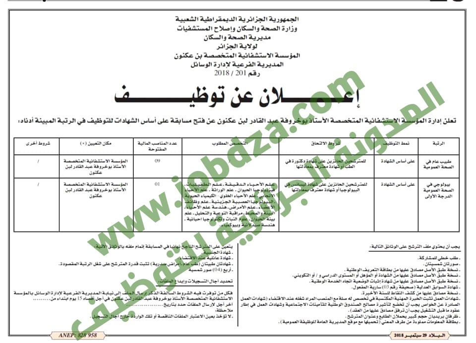 مستشفى بن عكنون يوظف أطباء و بيولوجيون المدونـــة الجزائريـــــة للتوظيف